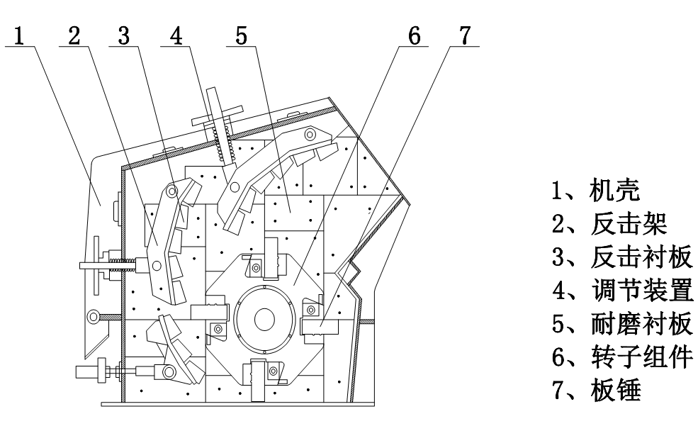 工作原理:轉(zhuǎn)子在電機帶動下高速旋轉(zhuǎn),物料進入后與轉(zhuǎn)子上的板錘撞擊,物料收到板錘的高速沖擊而破碎,破碎后的物料又被又被反擊到襯板上再次破碎,最后合格的物料從出料口排除,調(diào)節(jié)反擊板錘架和轉(zhuǎn)子之間的間隙可達到改變物料出料粒度和形狀的目的。
